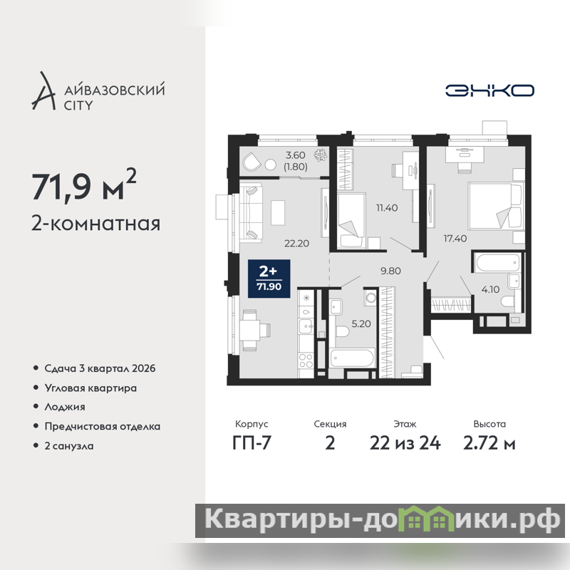 2-комн. квартира от застройщика с предчистовой отделкой в ЖК "Айвазовский City" на 22 этаже. Общая площадь: 71.9 кв.м., жилая: 28.8 кв.м., площадь просторной кухни-столовой: 22.2 кв.м. Угловая квартира, идеально подойдет любителям тишины и панорамных видов. В квартире одна лоджия, два совмещенных санузла. Высота потолков 2.72 м.
