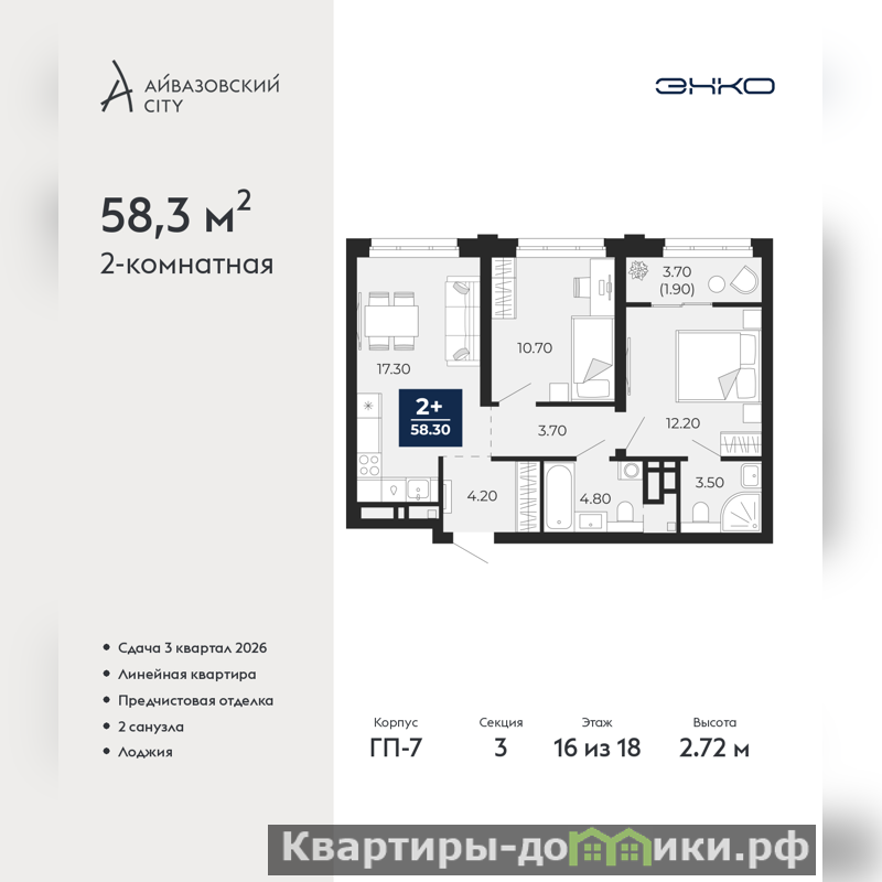 Двухкомнатная квартира от застройщика с предчистовой отделкой в ЖК "Айвазовский City" на 16 этаже. Общая площадь: 58.3 кв.м., жилая: 22.9 кв.м., площадь просторной кухни-столовой: 17.3 кв.м. Комнаты изолированные, все окна выходят на одну сторону. В квартире одна лоджия, два совмещенных санузла. Высота потолков 2.72 м.