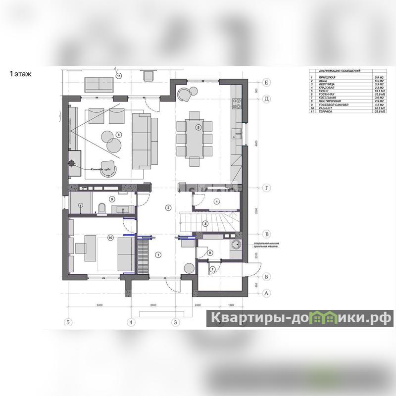 1 этаж: прихожая, гостевая спальня, санузел, гостиная-кухня, гордеробная, постирочная, котельная;