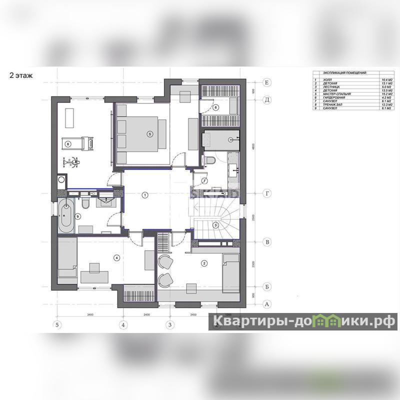 2 этаж: мастер-спальня со своей гардеробной, 2 спальни, 2 санузла, спортивный зал либо кабинет.