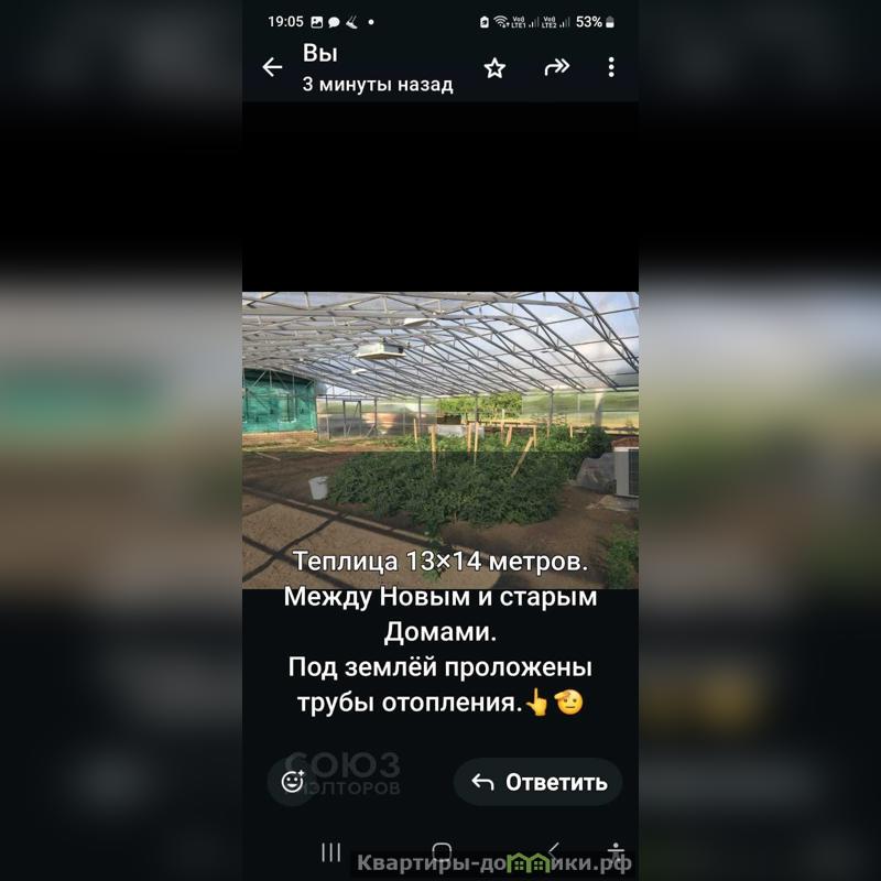 На участке между домами расположена теплица, очень удобно выйти из дома сразу в теплицу в любое время года.Теплица с проложенными под землёй трубами отопления.