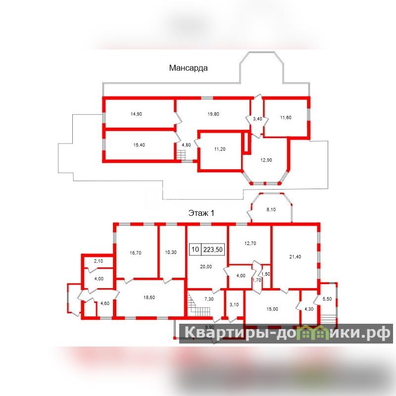 Первый дом общей площадью 223,5 кв.м построен в 1961-1978 годах. Фундамент ленточный бетонный, материал стен бревно. Дом оборудован двумя входами.
