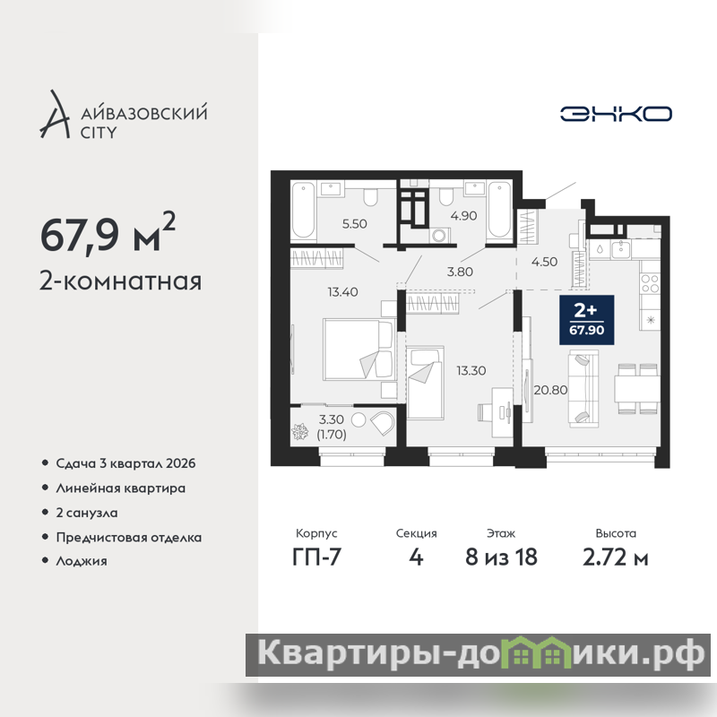 Двухкомнатная квартира с предчистовой отделкой в ЖК "Айвазовский City" на 8 этаже. Общая площадь: 67.9 кв.м., жилая: 26.7 кв.м., площадь просторной кухни-столовой: 20.8 кв.м. Комнаты изолированные, все окна выходят на одну сторону. В квартире одна лоджия, два совмещенных санузла. Высота потолков 2.72 м.