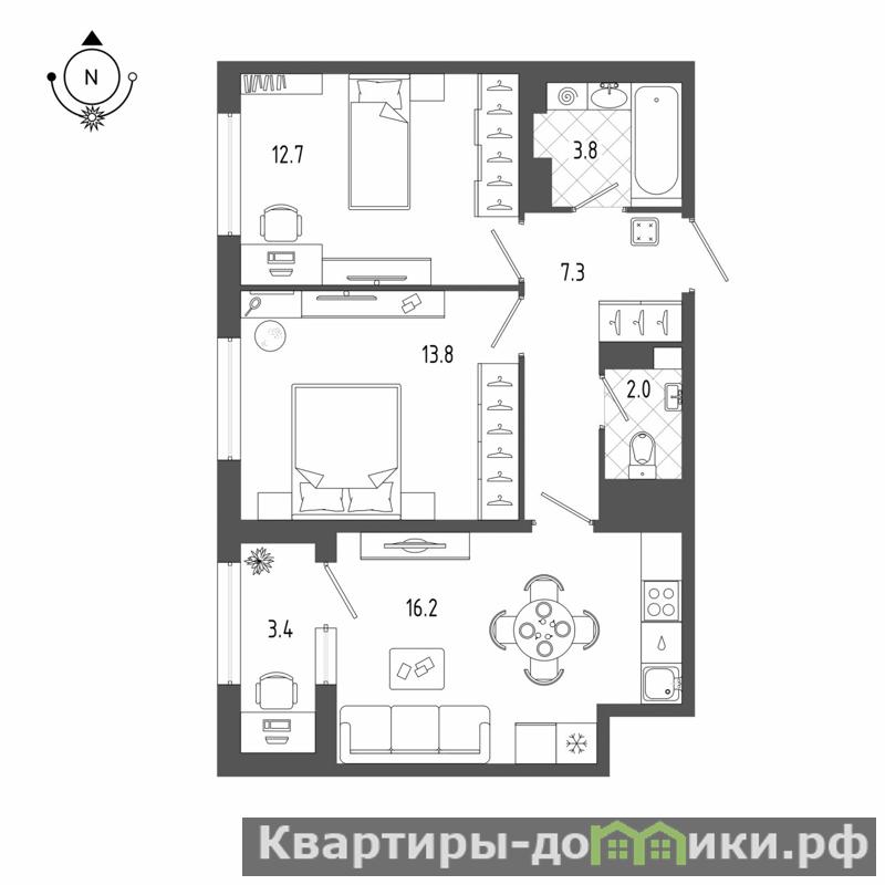 - Кухня-гостиная 16,2 м 2.; - Комната 13,8+12,7 м2; - Ванная комната 3,8 м2.; -Туалет 2,0 м2.;- Прихожая 7,3 м2.