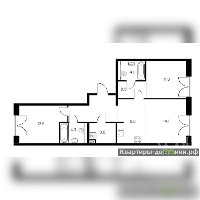 В квартире 2 санузла по 4,3м2+ 4,1 м2