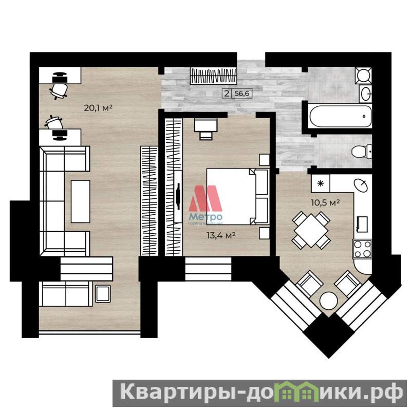 Изолированные комнаты: большая комната площадью 20,1 кв. м с выходом на балкон . Маленькая комната площадью 13,4 кв. м имеет правильную квадратную форму, удобна для расстановки мебели.