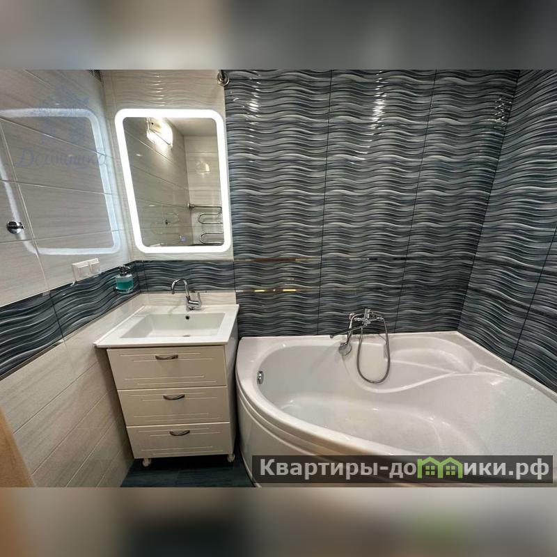 В ванной: умывальник, зеркало с подсветкой, угловая ванная, шкаф.