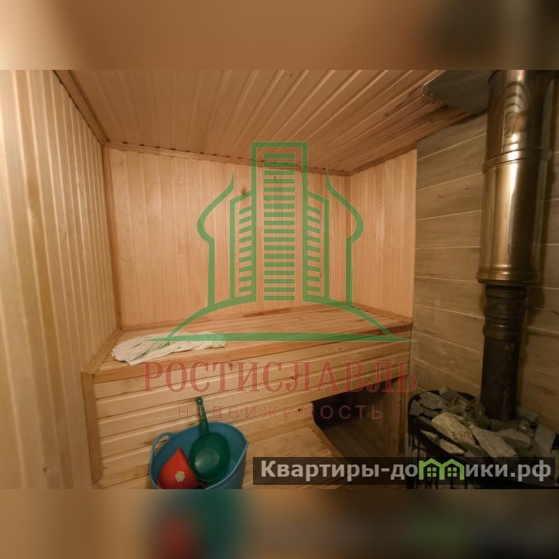 Баня (брус) с мансардой (каркасно-щитовая, утепленная) и верандой, две комнаты отдыха, парная, душ, туалет. Печка при входе, от трубы тепло на втором этаже. Общий размер 6 х 7.