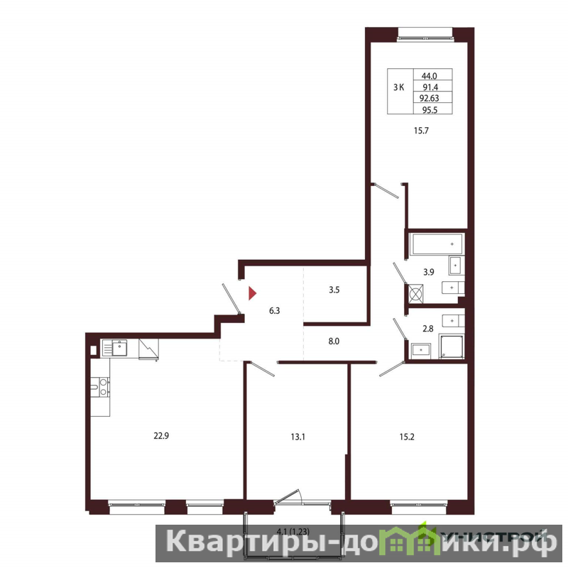 Продается 3-комн. квартира, площадью 92.63 м2. Жилая площадь 44 м2, кухня 22.9 м2. Площадь комнат: 15.70/15.20/13.10 м2. Раздельных санузлов - 1. Квартира располагается на 2 этаже 5-этажного дома в ЖК Лисино. , сдача дома - IV квартал 2027 года Позвоните и узнайте условия покупки прямо сейчас!