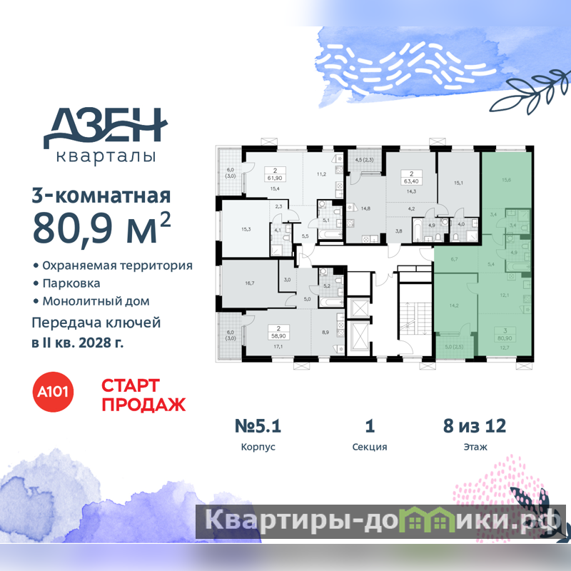 3-комн. квартира бизнес-класса с европланировкой и отделкой в ЖК "Дзен-кварталы" на 8 этаже. Общая площадь: 80.9 кв.м., жилая: 41.9 кв.м., общая площадь гостиной-столовой с кухонной зоной: 24.8 кв.м. Европланировка, зона гостиной комнаты объединена с кухней. Квартира - распашонка, без проходных комнат, окна выходят на paзные стороны дома. В квартире одна лоджия, два совмещенных санузла. Высота потолков 3.1 м.