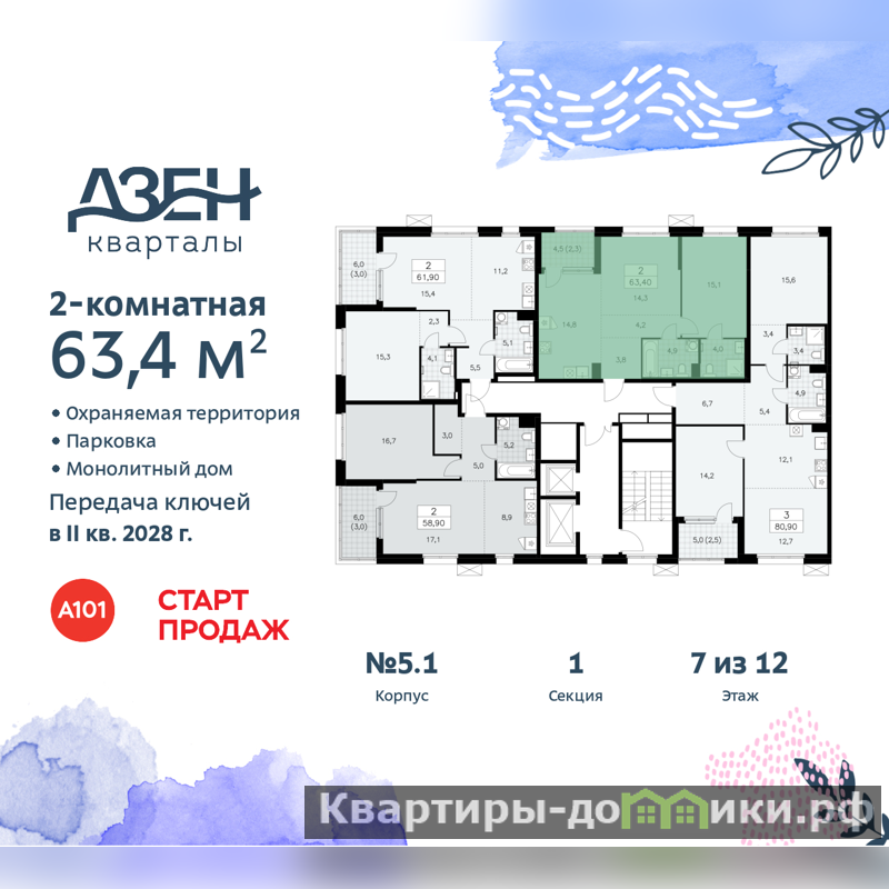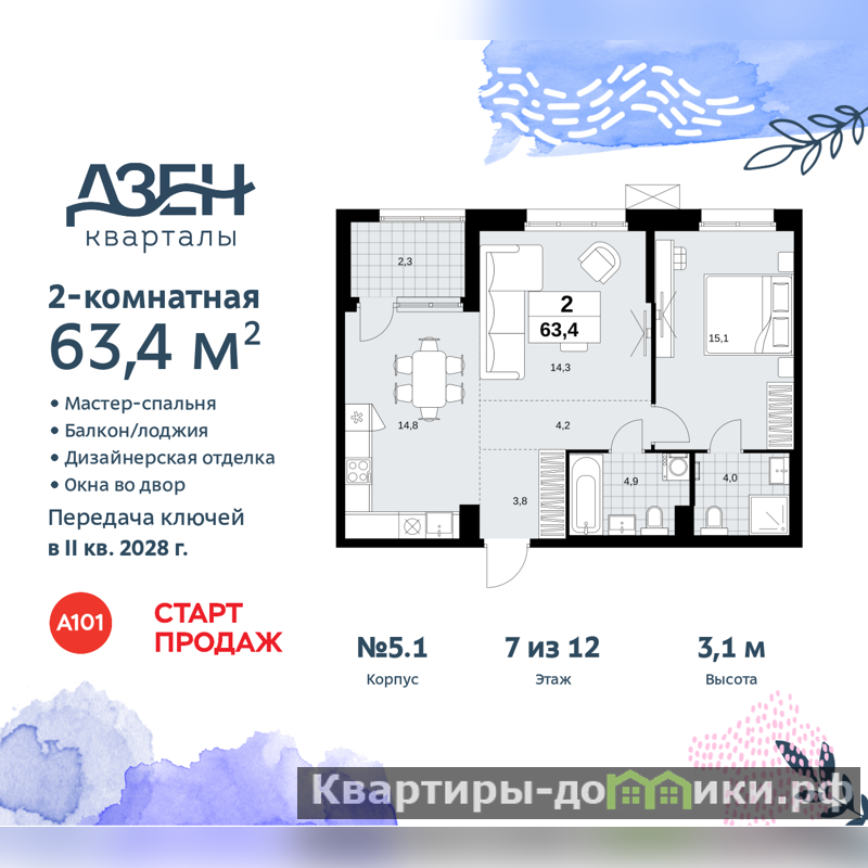 Продается двухкомнатная квартира бизнес-класса с европланировкой и отделкой в ЖК "Дзен-кварталы" на 7 этаже. Общая площадь: 63.4 кв.м., жилая: 29.4 кв.м., суммарная площадь гостиной-столовой с кухонной зоной: 29.1 кв.м. Европейская планировка, зона гостиной комнаты объединена с кухней. Комнаты изолированные, все окна выходят на одну сторону. В квартире одна лоджия, два совмещенных санузла. Высота потолков 3.1 м.