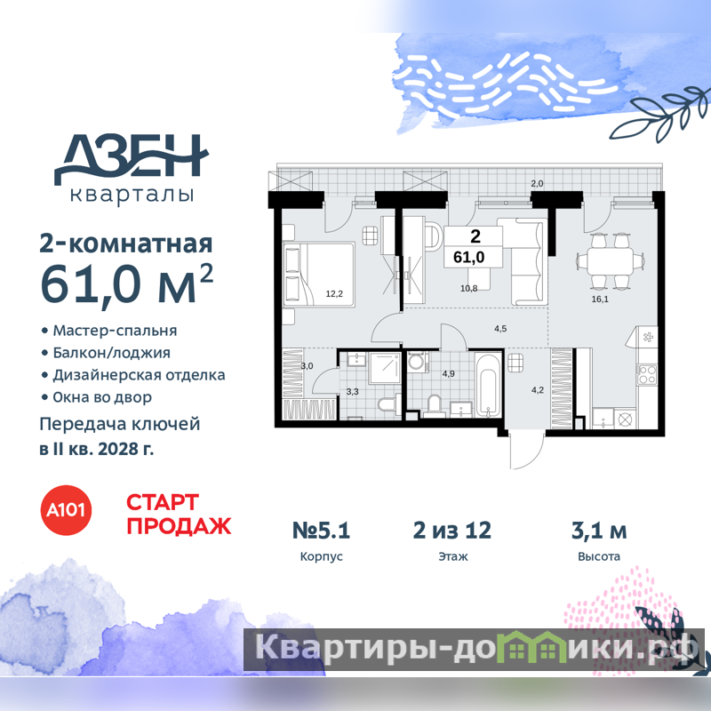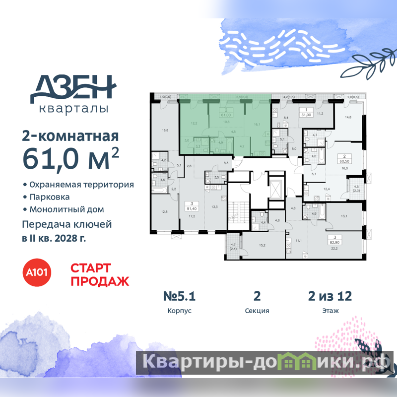 2-комн. квартира бизнес-класса с отделкой в ЖК "Дзен-кварталы" на 2 этаже. Общая площадь: 61 кв.м., жилая: 23 кв.м., площадь просторной кухни-столовой: 16.1 кв.м. Комнаты изолированные, все окна выходят на одну сторону. В квартире один балкон, два совмещенных санузла. Высота потолков 3.1 м.