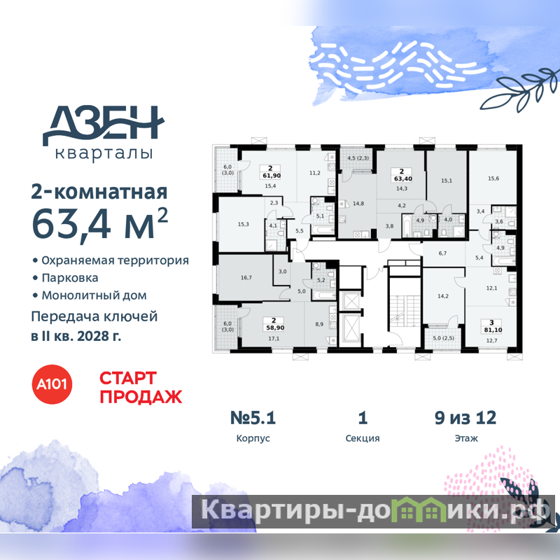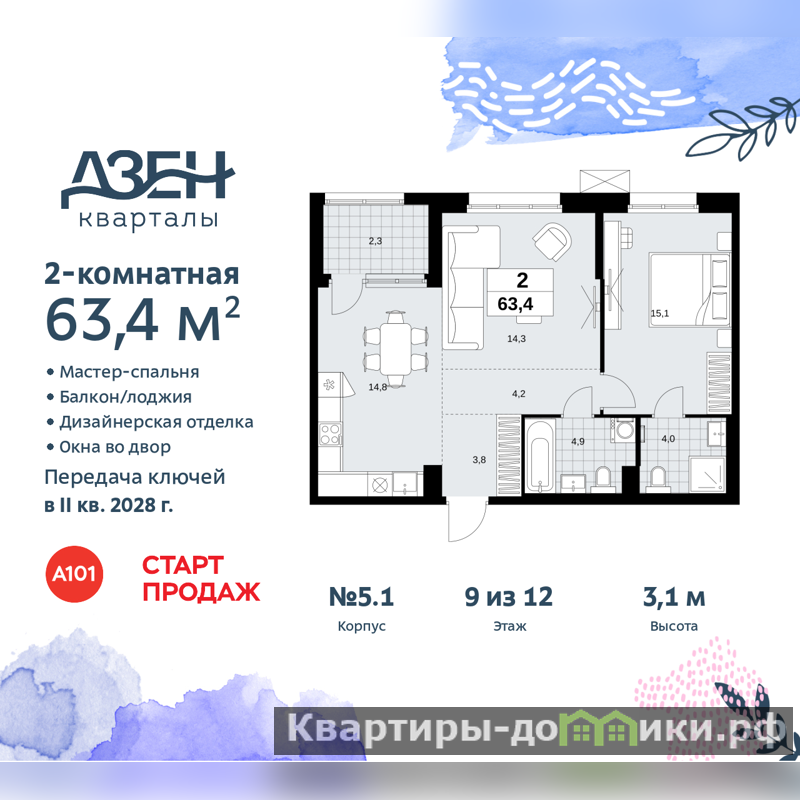 Двухкомнатная квартира бизнес-класса с европланировкой и отделкой в ЖК "Дзен-кварталы" на 9 этаже. Общая площадь: 63.4 кв.м., жилая: 29.4 кв.м., общая площадь гостиной-столовой с кухонной зоной: 29.1 кв.м. Европейская планировка, кухня-гостиная - идеальный вариант для тех, кто любит часто принимать гостей. Комнаты изолированные, все окна выходят на одну сторону. В квартире одна лоджия, два совмещенных санузла. Высота потолков 3.1 м.