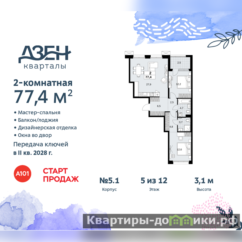 Продается 2-комн. квартира бизнес-класса от застройщика с отделкой в ЖК "Дзен-кварталы" на 5 этаже. Общая площадь: 77.4 кв.м., жилая: 24.8 кв.м., площадь просторной кухни-столовой: 27.9 кв.м. Квартира - распашонка, без проходных комнат, окна выходят на paзные стороны дома. В квартире одна лоджия, два совмещенных санузла. Высота потолков 3.1 м.