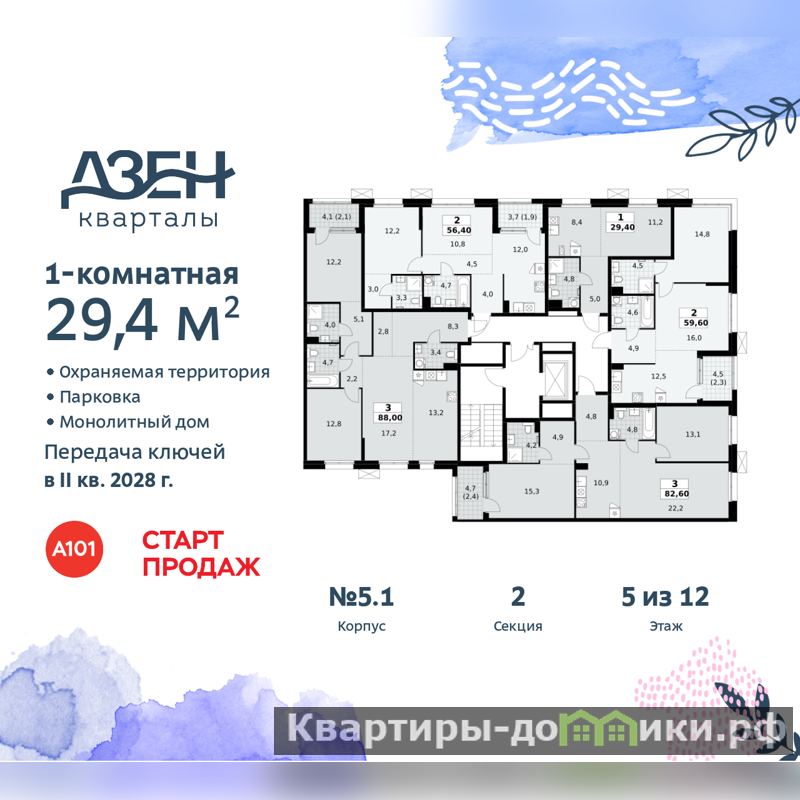 Дом монолитный, черырехподъездный, переменной этажности, от 8 до 12 этажей. Квартира находится во 2-й секции высотой 8 этажей в корпусе бизнес-класса 5.1. На этаже 5 квартир. В подъезде 1 грузовой лифт. Начало строительства - 3 квартал 2025 года. Окончание строительства - 2 квартал 2028 года. Оформление сделки по договору долевого участия.