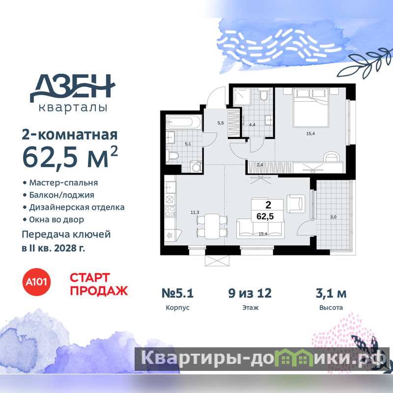 2-комн. квартира бизнес-класса с европланировкой и отделкой в ЖК "Дзен-кварталы" на 9 этаже. Общая площадь: 62.5 кв.м., жилая: 30.8 кв.м., суммарная площадь гостиной-столовой с кухонной зоной: 26.7 кв.м. Европланировка, в просторной кухне-гостиной удобно как готовить, так и отдыхать. Угловая квартира, очень светлая, естественная вентиляция при открытии окон. В квартире одна лоджия, два совмещенных санузла. Высота потолков 3.1 м.