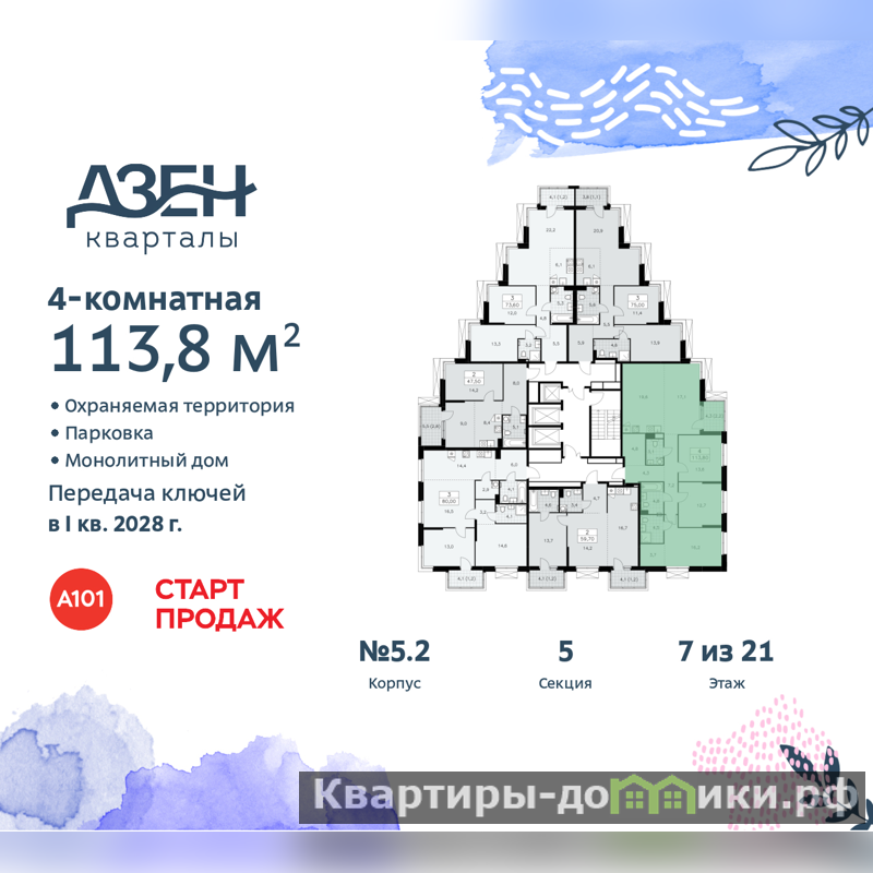 Квартира находится в корпусе 5.2. Дом монолитный, одноподъездный, высотой 21 этаж. На этаже 6 квартир. В подъезде 1 пассажирский и 2 грузовых лифта. Начало строительства - 3 квартал 2025 года. Окончание строительства - 1 квартал 2028 года. Оформление сделки по договору долевого участия.