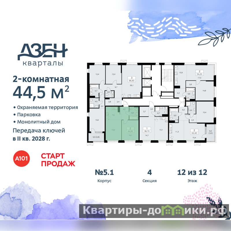 Дом монолитный, черырехподъездный, переменной этажности, от 8 до 12 этажей. Квартира находится в 4-й секции высотой 12 этажей в корпусе бизнес-класса 5.1. На этаже 5 квартир. В подъезде 1 пассажирский и 1 грузовой лифт. Начало строительства - 3 квартал 2025 года. Окончание строительства - 2 квартал 2028 года. Оформление сделки по договору долевого участия.