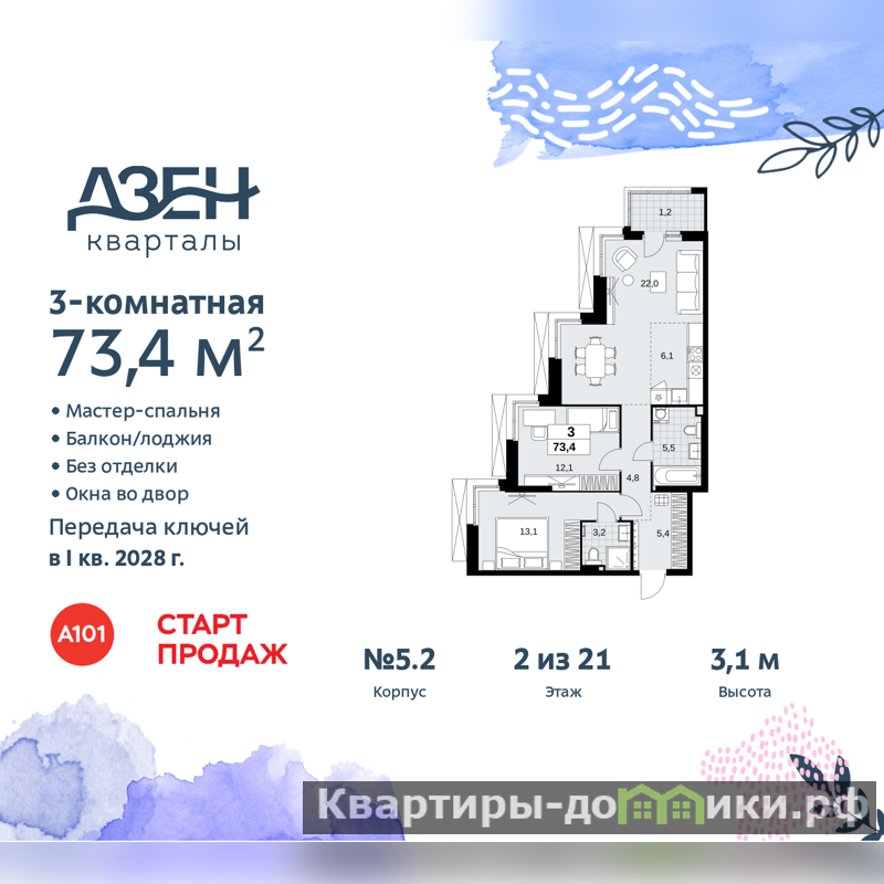 Продается 3-комн. квартира бизнес-класса с европланировкой в ЖК "Дзен-кварталы" на 2 этаже. Квартира без отделки, новый собственник может сделать ремонт по своему дизайн-проекту. Общая площадь: 73.4 кв.м., жилая: 47.2 кв.м., общая площадь гостиной-столовой с кухонной зоной: 28.1 кв.м. Европланировка, кухня и гостиная объединены в одно просторное помещение. Угловая квартира, окна oбecпeчивaют paвнoмepнoe ocвeщeниe в тeчeниe дня. В квартире один балкон, два совмещенных санузла. Высота потолков 3.1 м.