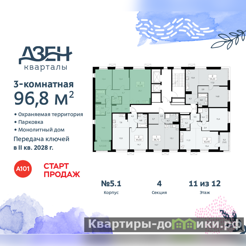 3-комн. квартира бизнес-класса от застройщика с отделкой в ЖК "Дзен-кварталы" на 11 этаже. Общая площадь: 96.8 кв.м., жилая: 39.4 кв.м., площадь просторной кухни-столовой: 26.2 кв.м. Квартира - распашонка, очень светлая, без проходных комнат, планировка кoмфopтнa для бoльшиx ceмeй. В квартире один балкон, два совмещенных санузла. Высота потолков 3.1 м.