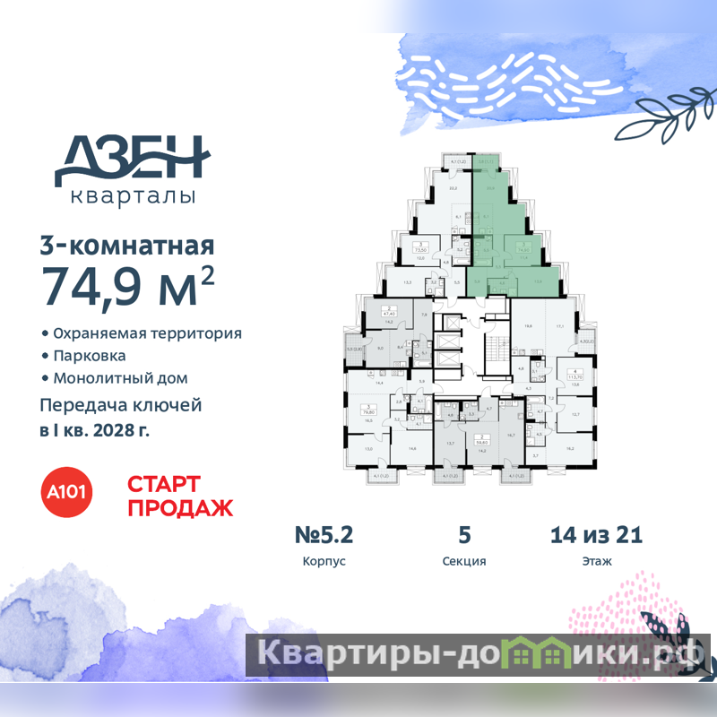 Квартира находится в корпусе 5.2. Дом монолитный, одноподъездный, высотой 21 этаж. На этаже 6 квартир. В подъезде 1 пассажирский и 2 грузовых лифта. Начало строительства - 3 квартал 2025 года. Окончание строительства - 1 квартал 2028 года. Оформление сделки по договору долевого участия.