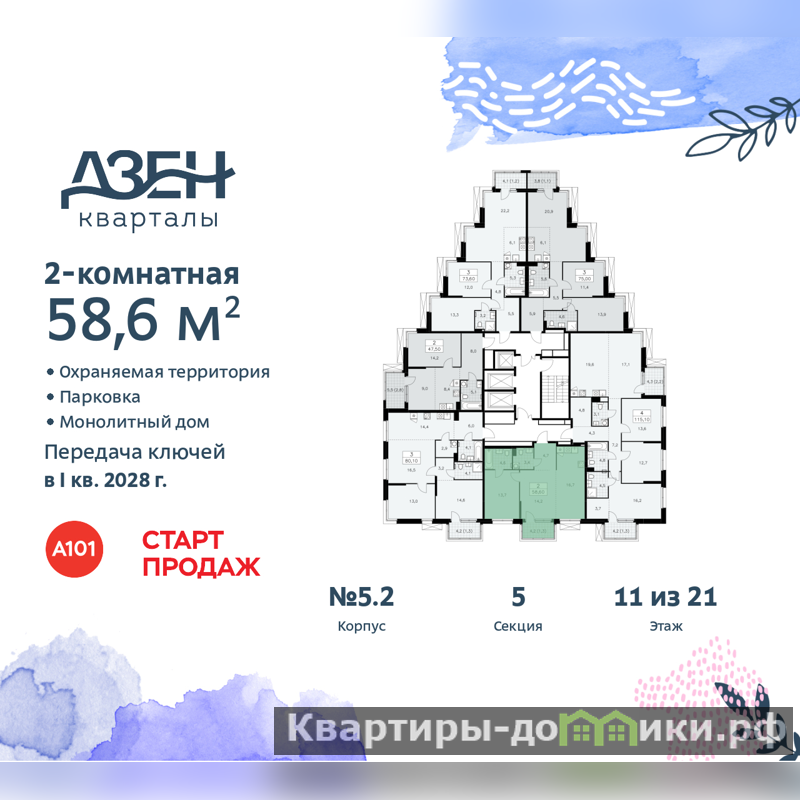 Квартира находится в корпусе 5.2. Дом монолитный, одноподъездный, высотой 21 этаж. На этаже 6 квартир. В подъезде 1 пассажирский и 2 грузовых лифта. Начало строительства - 3 квартал 2025 года. Окончание строительства - 1 квартал 2028 года. Оформление сделки по договору долевого участия.