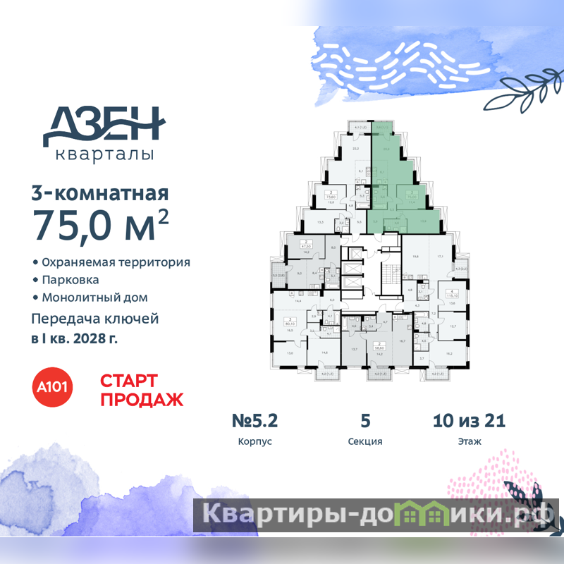 Квартира находится в корпусе 5.2. Дом монолитный, одноподъездный, высотой 21 этаж. На этаже 6 квартир. В подъезде 1 пассажирский и 2 грузовых лифта. Начало строительства - 3 квартал 2025 года. Окончание строительства - 1 квартал 2028 года. Оформление сделки по договору долевого участия.