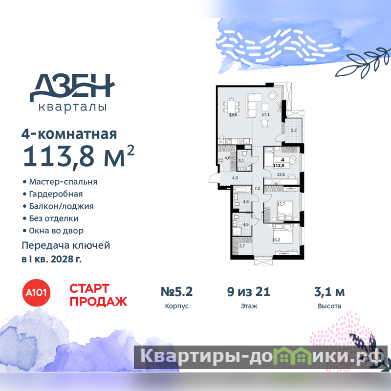 Четырехкомнатная квартира бизнес-класса с европланировкой от застройщика в ЖК "Дзен-кварталы" на 9 этаже. Квартира без отделки, полностью готова к ремонту. Общая площадь: 113.8 кв.м., жилая: 59.6 кв.м., суммарная площадь гостиной-столовой с кухонной зоной: 36.7 кв.м. Европейская планировка, площадь комнат позволяет разместить в них все необходимое, а в просторной кухне-гостиной удобно как готовить, так и отдыхать. Угловая квартира, идеально подойдет любителям тишины и панорамных видов. В квартире одна лоджия, два совмещенных и один раздельный санузел. Высота потолков 3.1 м.