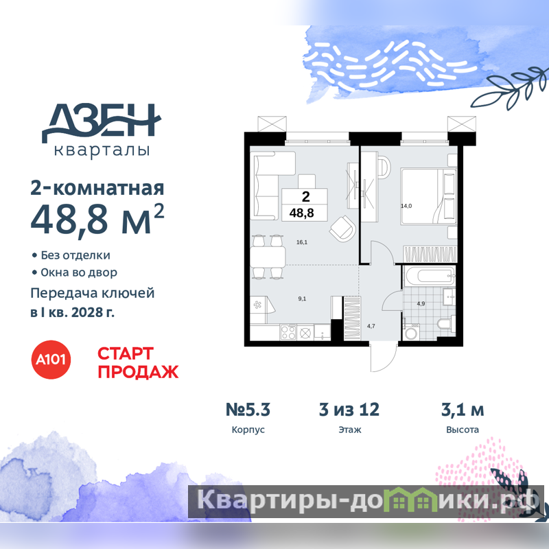 2-комн. квартира бизнес-класса с европланировкой в ЖК "Дзен-кварталы" на 3 этаже. Квартира без отделки, новый собственник может сделать ремонт по индивидуальному дизайн-проекту. Общая площадь: 48.8 кв.м., жилая: 30.1 кв.м., общая площадь гостиной-столовой с кухонной зоной: 25.2 кв.м. Европейская планировка, зона гостиной комнаты объединена с кухней. Комнаты изолированные, все окна выходят на одну сторону. В квартире один совмещенный санузел. Высота потолков 3.1 м.