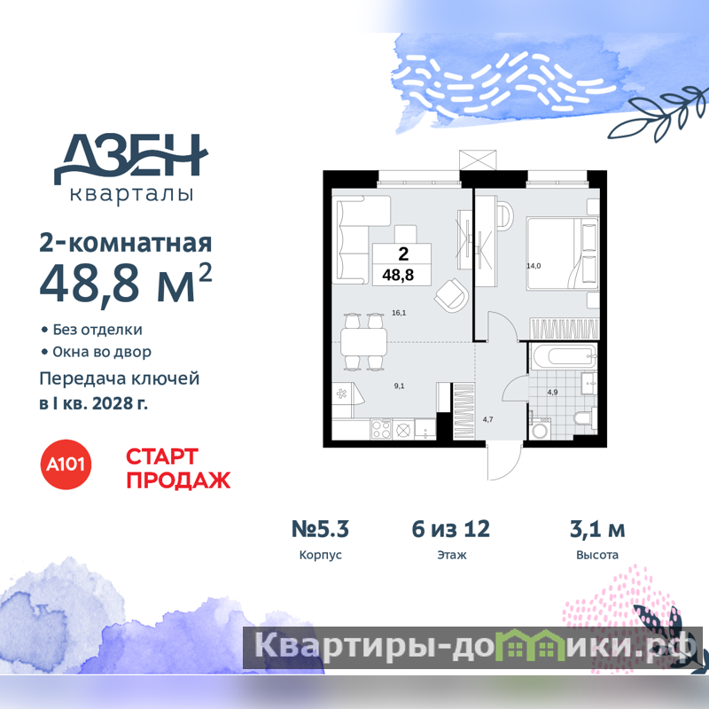 Продается 2-комн. квартира бизнес-класса с европланировкой в ЖК "Дзен-кварталы" на 6 этаже. Квартира без отделки, полностью готова к чистовой отделке и дальнейшему ремонту. Общая площадь: 48.8 кв.м., жилая: 30.1 кв.м., суммарная площадь гостиной-столовой с кухонной зоной: 25.2 кв.м. Европланировка, кухня-гостиная - идеальный вариант для тех, кто любит часто принимать гостей. Комнаты изолированные, все окна выходят на одну сторону. В квартире один совмещенный санузел. Высота потолков 3.1 м.