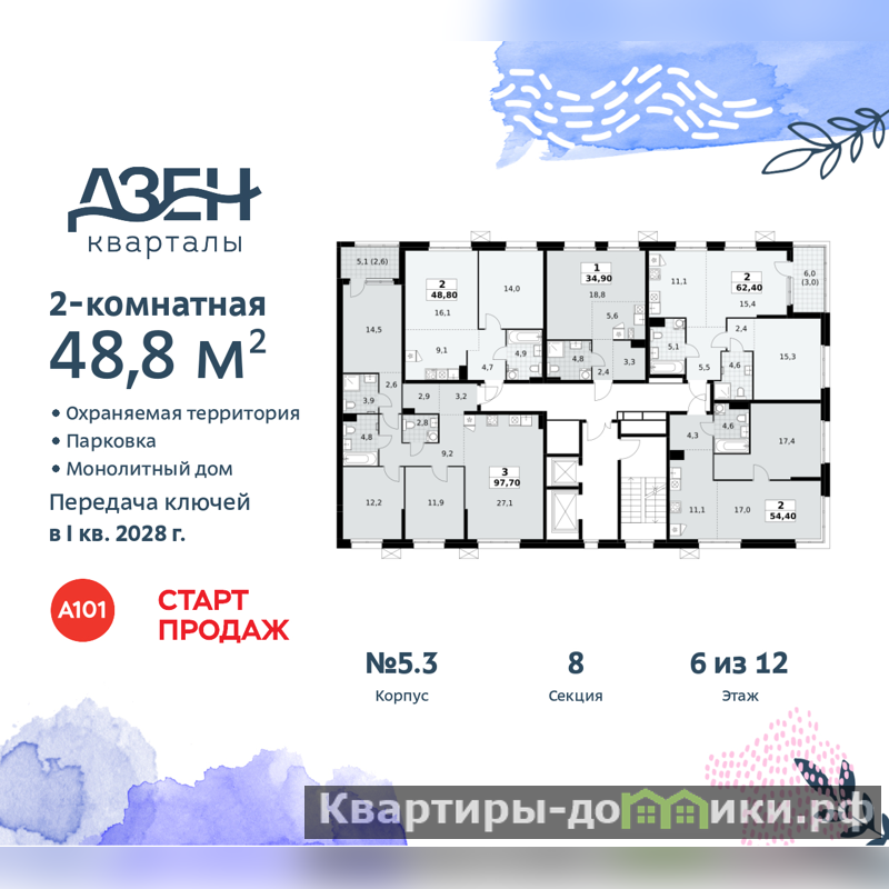 Дом монолитный, трехподъездный, переменной этажности, от 8 до 12 этажей. Квартира находится в 3-й секции высотой 12 этажей в корпусе бизнес-класса 5.3. На этаже 5 квартир. В подъезде 1 пассажирский и 1 грузовой лифт. Начало строительства - 3 квартал 2025 года. Окончание строительства - 1 квартал 2028 года. Оформление сделки по договору долевого участия.