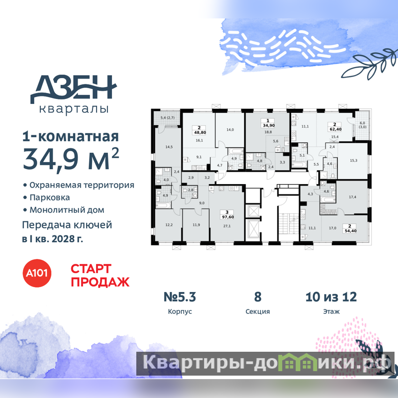 1-комн. квартира бизнес-класса-студия от застройщика в ЖК "Дзен-кварталы" на 10 этаже. Квартира без отделки, после оформления собственности можно делать ремонт. Общая площадь: 34.9 кв.м., площадь гостиной 24.4 кв.м., из которых 5.6 кв.м. выделено под кухонную зону. Все окна выходят на одну сторону. В квартире один совмещенный санузел. Высота потолков 3.1 м.