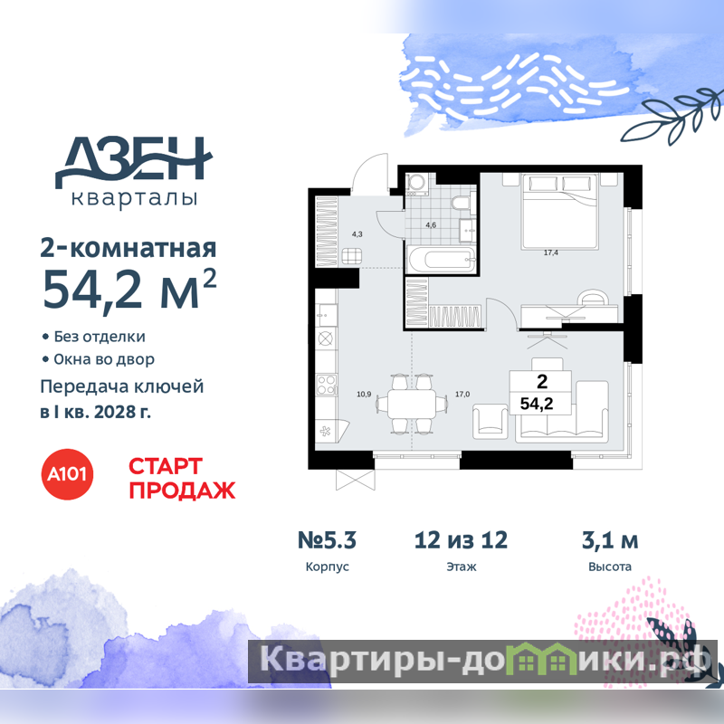 Двухкомнатная квартира бизнес-класса с европланировкой от застройщика в ЖК "Дзен-кварталы" на 12 этаже. Квартира без отделки, новый владелец может сделать ремонт по индивидуальному дизайн-проекту. Общая площадь: 54.2 кв.м., жилая: 31.8 кв.м., суммарная площадь гостиной-столовой с кухонной зоной: 27.9 кв.м. Европланировка, кухня-гостиная - идеальный вариант для тех, кто любит часто принимать гостей. Угловая квартира, очень светлая, естественная вентиляция при открытии окон. В квартире один совмещенный санузел. Высота потолков 3.1 м.