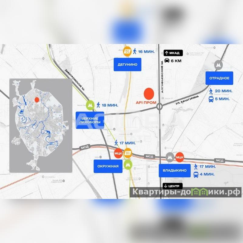 Близость комплекса AFI ПРОМ Алтуфьево к основным магистралям обеспечивает удобную логистику как для персонала, так и для грузоперевозок. В шаговой доступности находятся 5 станций метро/МЦК: "Дегунино", "Владыкино", "Отрадное", "Окружная", "Верхние Лихоборы". До Алтуфьевского шоссе всего 2 минуты, до СВХ и Дмитровского шоссе 5 минут, до ТТК 7 минут.