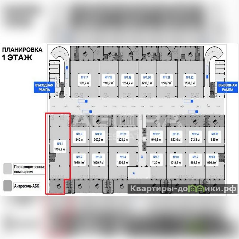 От собственника - ПСН для размещения производства, цеха, склада или офиса (шоу-рума и офиса продаж). Производственное помещение расположено в 4-х этажном здании на территории промышленного кластера лайт-индастриал, на северо-востоке столицы, в районе Отрадное. Помещение площадью 1705,9 м2 находится на 1-м этаже (блок на плане 1.1). В этом помещении предусмотрена антресоль на высоте 4 метра - для размещения административного персонала и обеспечения бытовых нужд работников (АБК). Высота потолков 7 метров, нагрузка на пол на 1-м этаже – 4 тн/м2, шаг колонн — 12 м*12 м. Электрическая мощность 154 кВт (из расчета 90 Вт на м2). Помещение относится к городской промышленной недвижимости для малого и среднего бизнеса, это 1-я очередь проекта AFI ПРОМ Алтуфьево, общая площадь 1-й очереди 133 700 м2, срок ввода в эксплуатацию – декабрь 2026 года. В 1-й очереди – всего 87 помещений (на 1,2,3 и 4 этажах).