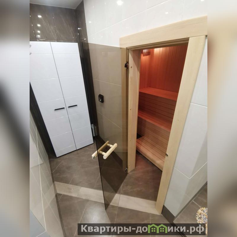 - Три этажа: вход со среднего уровня, где расположена кухня-гостиная и санузел; нижний этаж — гостевая комната с выходом на террасу, просторная гардеробная, сауна, санузел и техническая зона; верхний этаж — спальня (которая при желании может быть разделена на две комнаты), балкон и свой санузел с душевой кабиной.