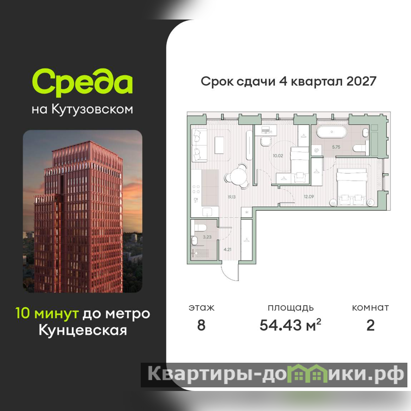 Продается 2-комн. квартира, площадью 54.43 м2 в монолитной новостройке в 12 мин. пешком от м. Кунцевская, район города - Кунцево. Возможен вариант покупки с использованием ипотечных средств, есть рассрочка.