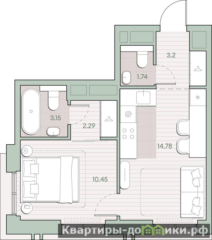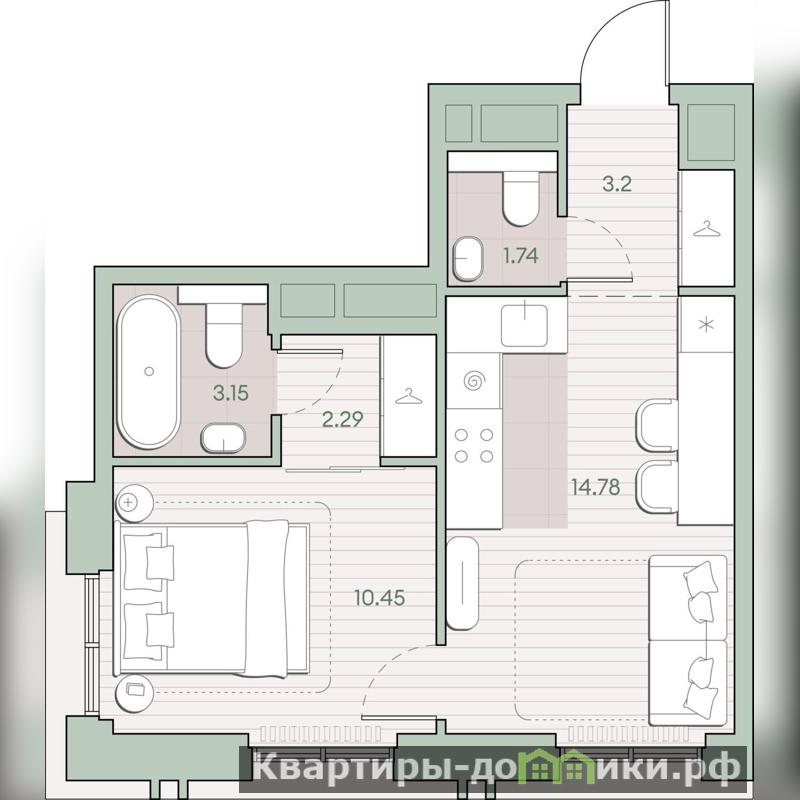 Жилая площадь 10.45 м2, кухня 14.78 м2, предчистовая отделка, комнаты изолированные.