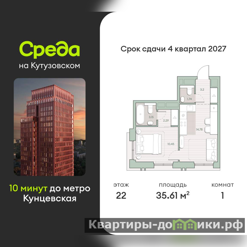 Продается 1-комн. квартира, площадью 35.61 м2 в монолитной новостройке в 12 мин. пешком от м. Кунцевская, район города - Кунцево. Возможен вариант покупки с использованием ипотечных средств, есть рассрочка.