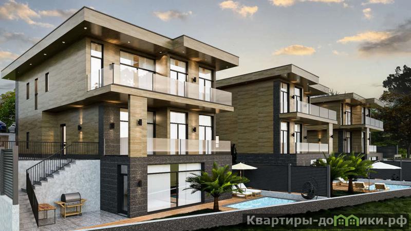 Вилла из трех этажей, монументальное строение. Высокие потолки, фасад из натурального травертина, панорамные окна.