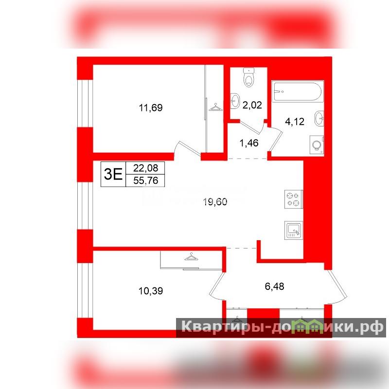 -Общая площадь: 55,76 кв.м.