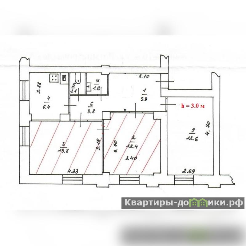 Уютные 2 комнаты (13.8 и 12.4 кв.м) в 3-х комнатной квартире (57.6 кв.м) на первом этаже двухэтажного кирпичного дома. Кухня площадью 6.4 кв.м..