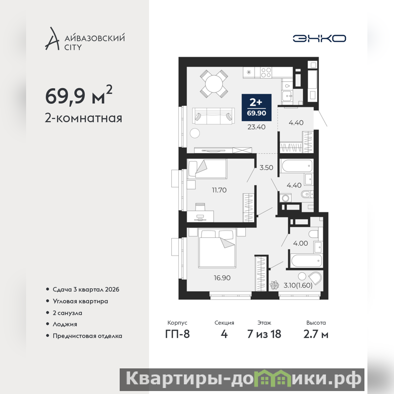 2-комн. квартира от застройщика с предчистовой отделкой в ЖК "Айвазовский City" на 7 этаже. Общая площадь: 69.9 кв.м., жилая: 28.6 кв.м., площадь просторной кухни-столовой: 23.4 кв.м. Угловая квартира, окна oбecпeчивaют paвнoмepнoe ocвeщeниe в тeчeниe дня. В квартире одна лоджия, два совмещенных санузла. Высота потолков 2.7 м.