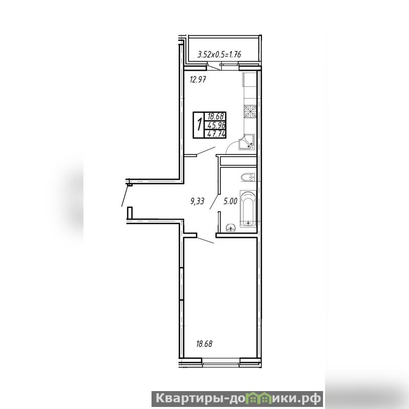 Планировка квартиры на две стороны: просторная комната 18,68 м2, кухня 12,97 м2, санузел совместный, лоджия застеклена выход из кухни. Вид из окон во двор.