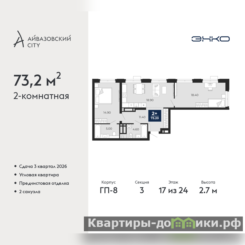 2-комн. квартира с предчистовой отделкой в ЖК "Айвазовский City" на 17 этаже. Общая площадь: 73.2 кв.м., жилая: 32.1 кв.м., площадь просторной кухни-столовой: 21.7 кв.м. Угловая квартира, очень светлая, естественная вентиляция при открытии окон. В квартире два совмещенных санузла. Высота потолков 2.7 м.