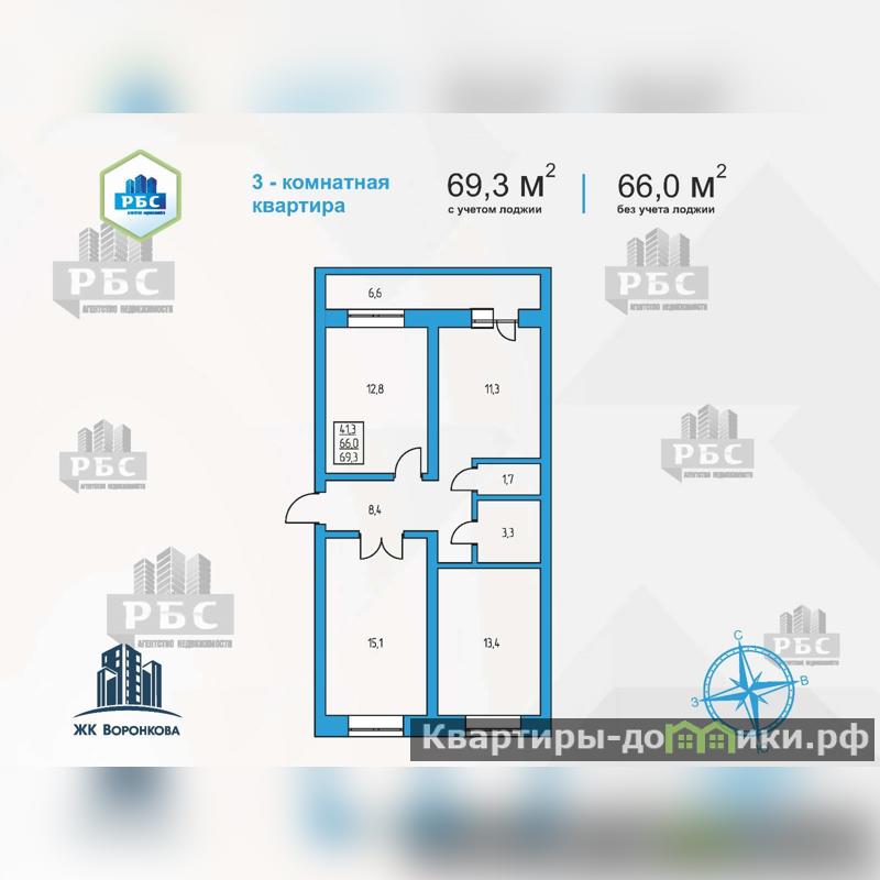 Предлагаем к продаже 3-комнатную квартиру в 16-этажном монолитно-кирпичном доме комфорт-класса ЖК Воронкова по ул.Воронкова, д.9 - ул.Студенческая. Дом сдан.