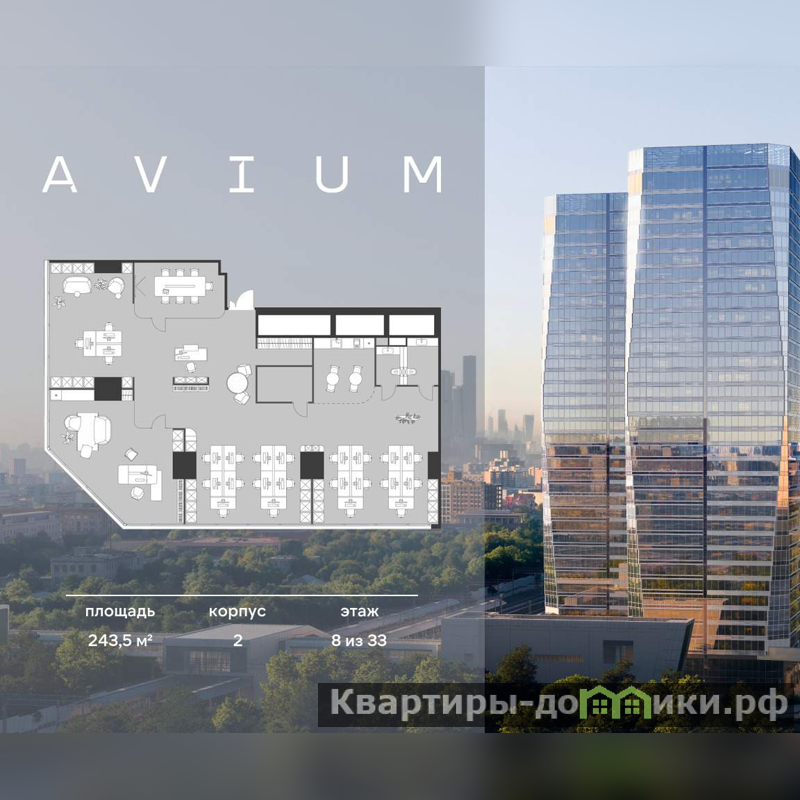 Возможны выгодные способы оплаты: рассрочка 0% до 31 месяца, ипотека 6% на 2 года. Продажа премиальных офисов в бизнес центре AVIUM. Две 34-этажные башни, объединённые галереей и дочерним корпусом. Здание класса А, этаж 5 из 33, просторный современный офис под чистовую отделку, открытая планировка, витринные окна, высота потолков 3,6 м. Сдача 2028 г, прямая продажа от застройщика Capital Alliance. Расположение и транспортная доступность: - Метро в шаговой доступности: МЦК Зорге - менее 1 минуты пешком, метро Октябрьское поле - 7 минут, ММДЦ Москва-Сити - 12 минут. - Удобный выезд на Ленинградский проспект и Звенигородское шоссе. Благоустройство: - Высококлассный бизнес-центр с авторской архитектурой и панорамными видами. - В каждой башне - эффектные лобби, современные переговорные и лаундж-зоны. Скоростные лифты с интеллектуальной системой, ожидание до 45 секунд. - Приточно-вытяжная вентиляция, индивидуальные санузлы, отдельные фуд-зоны. - Ландшафтный парк 1,2 Га и главный пешеходный бульвар для резидентов. Концепция сухие ноги - прямой доступ к торговым зонам без выхода на улицу. - Безопасность на высоте: видеонаблюдение и контроль доступа, система электронных пропусков, комплекс пожарной автоматики. - Чистый воздух, энергоэффективные технологии, уникальная концепция озеленения и биофильного дизайна. Инфраструктура комплекса: - Форматы на любой вкус - от кофе с собой до изысканных ресторанов с видом на бульвар. - Фитнес-студия, расположенная на втором этаже делового центра, позволяет легко сочетать рабочие задачи с заботой о себе. - Площадь современного ритейла на 7000 м. - Подземный паркинг для резидентов делового центра сочетает функциональность и футуристичный дизайн. Почему AVIUM: - Престиж, приватность, отличная транспортная доступность, новая доминанта района, признанная архитектура. - Пространства без колонн в углах, идеально подходят для руководителей и современных команд. - Форматы офисов для любого масштаба бизнеса: от 95 до 1345 м.