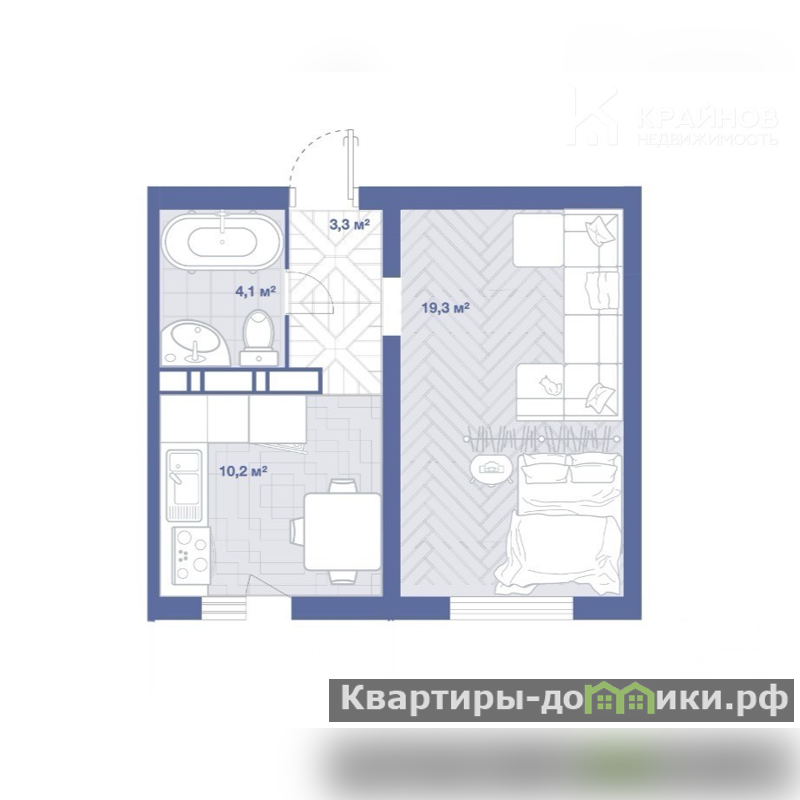 Площадь 36,6 кв.м, кухня 10,2 кв.м, комната 19,3 кв.м.