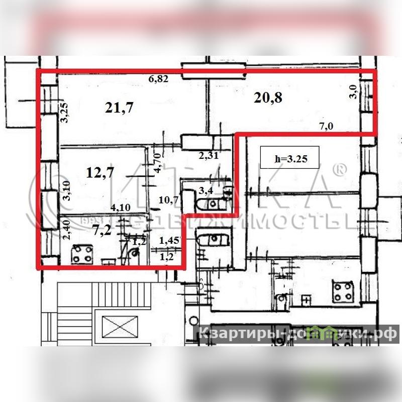 Квартира - двухсторонняя, с балконом в зеленый двор, и с видом на парк. Комнаты изолированы ( 21,7м2 + 20,8м2 + 12,7м2 ), кухня 8м2, санузел раздельный, высота потолка 3,20м.