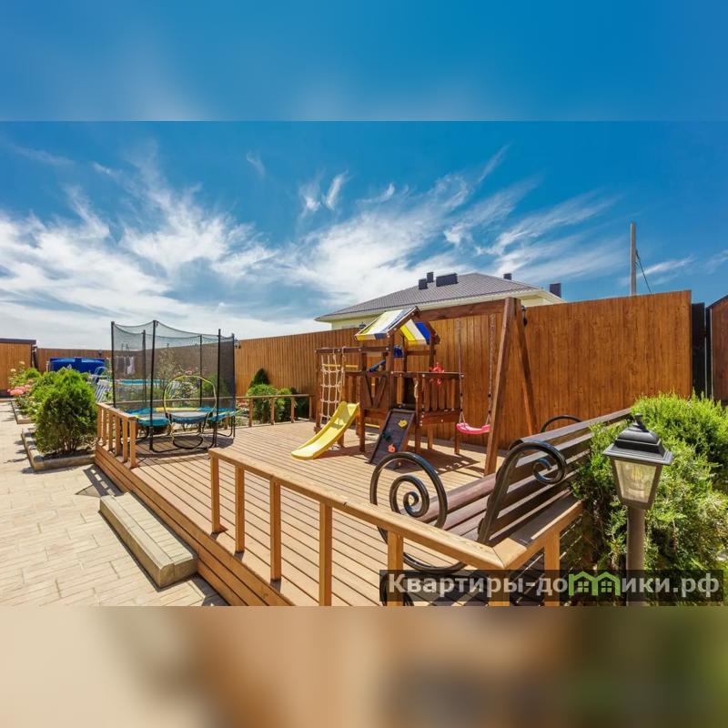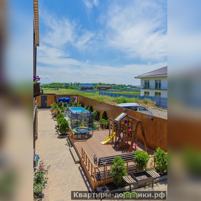 Во дворе детская игровая площадка, каркасный бассейн, мангал для приготовления шашлыка, столы, стулья, благоустроенный двор.